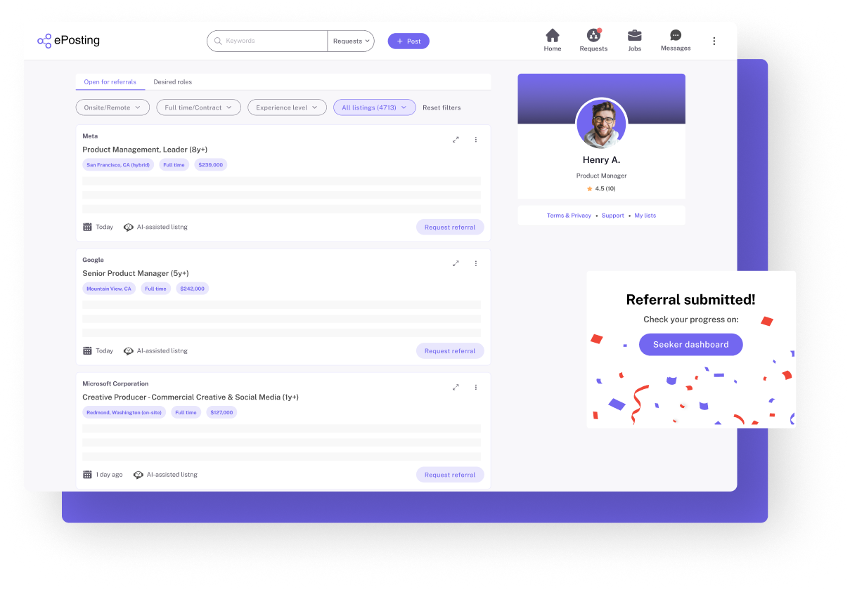 ePosting is a referral marketplace that connects you with insiders who can provide job referrals at your target companies. By offering a referral fee, you encourage them to help you discover and land your next opportunity.